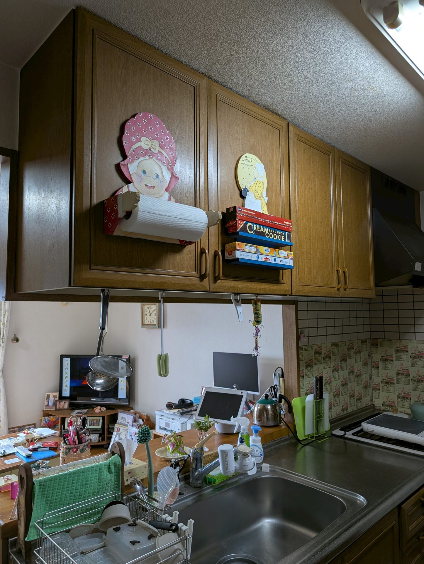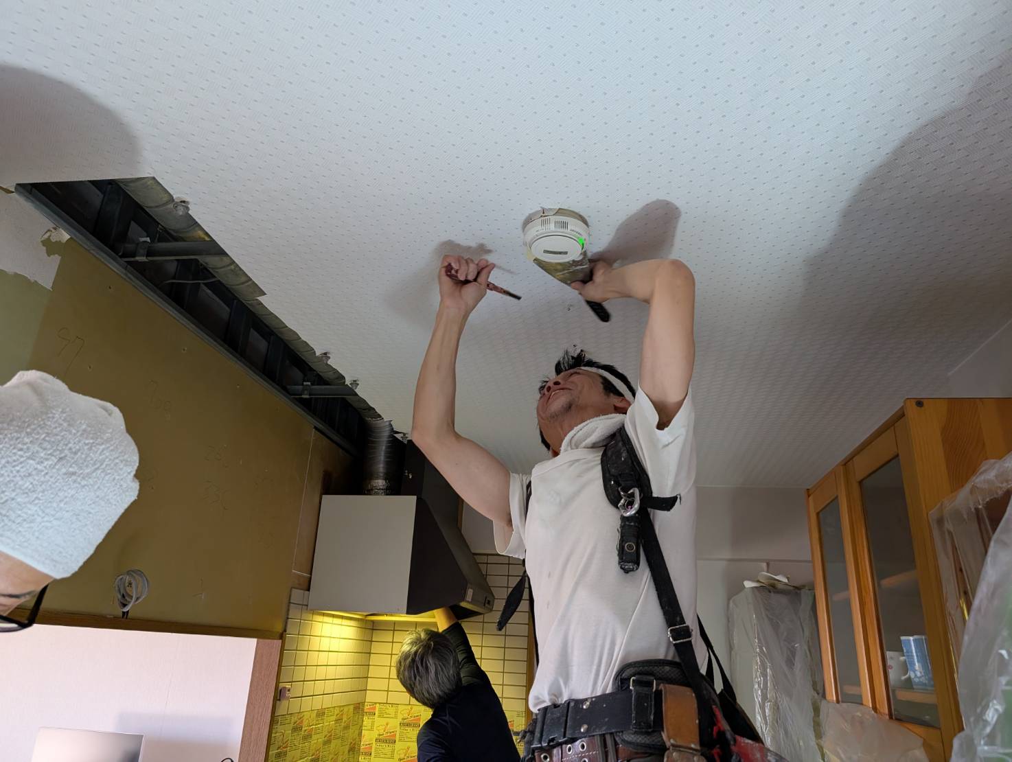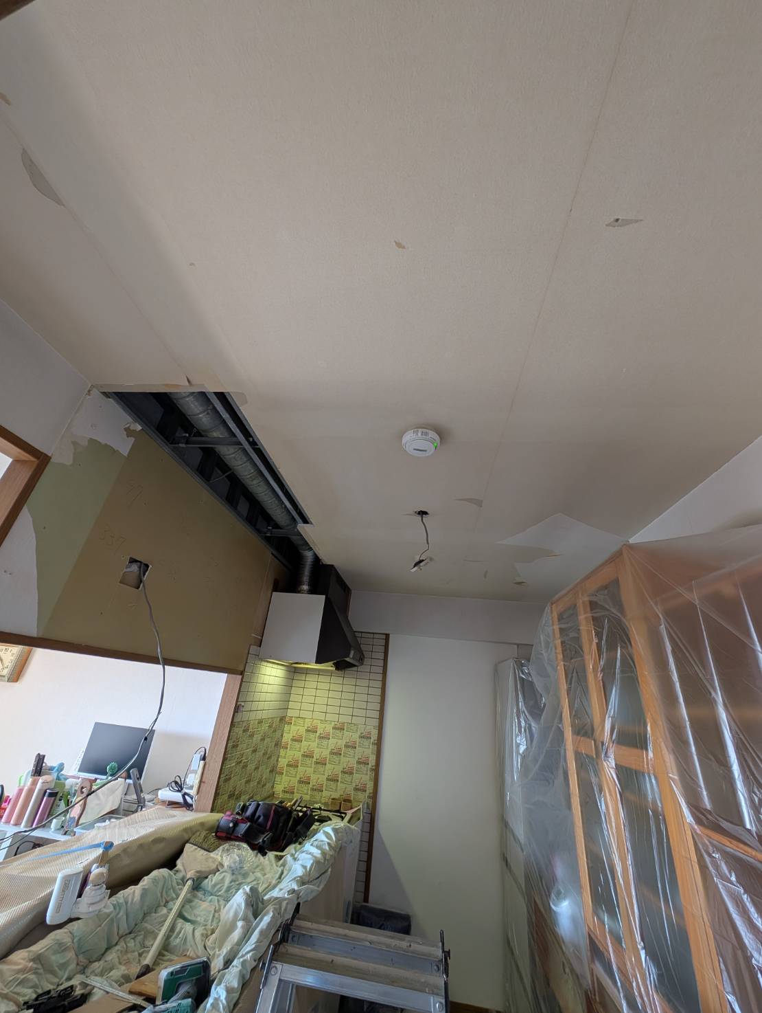 本日は、マンションの上階からの漏水により腐食した吊戸棚取替や天井下地材やビニールクロスの貼り替えを、おこないます。