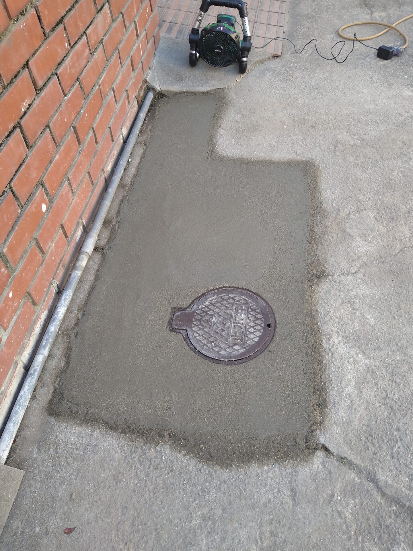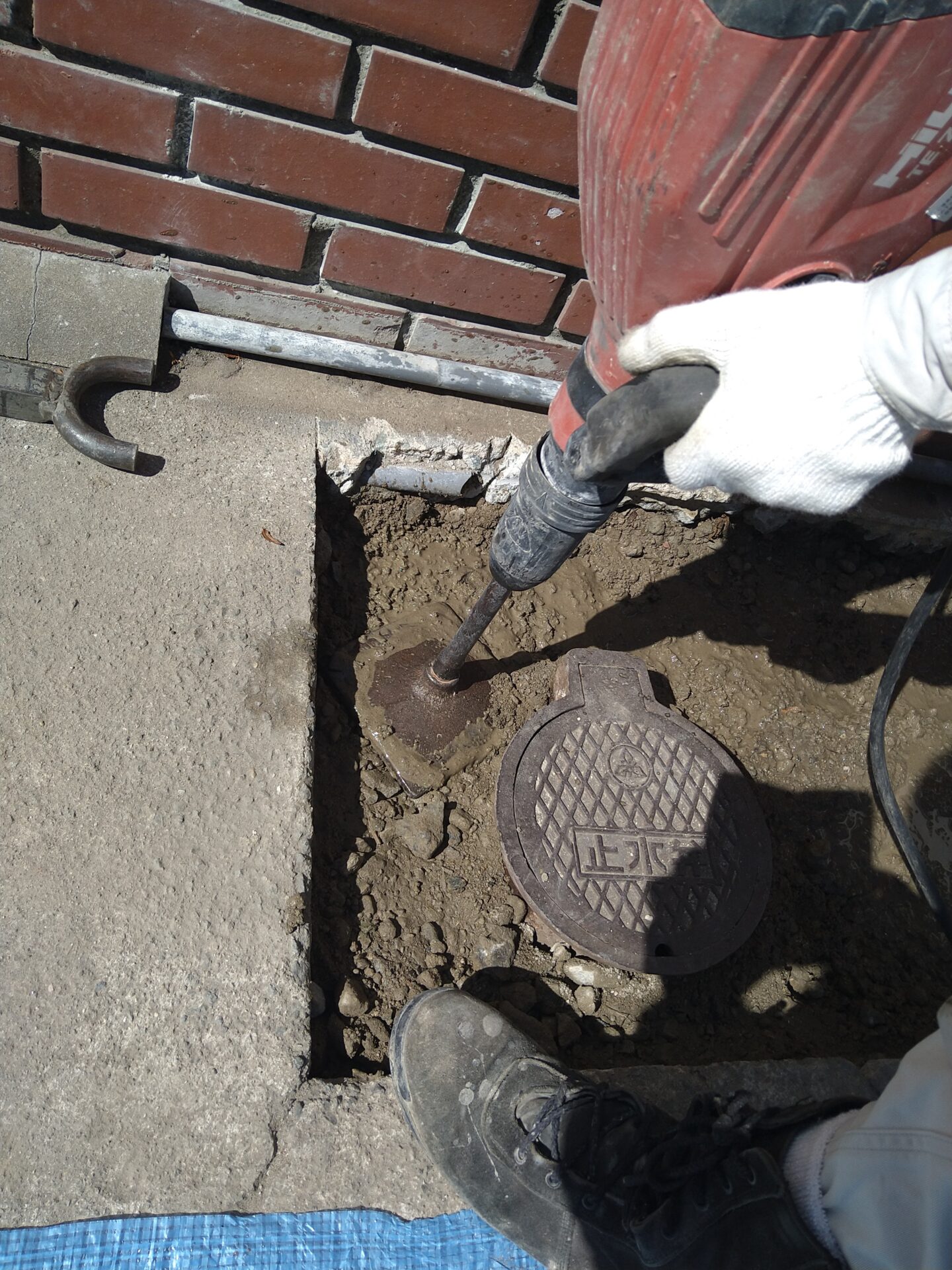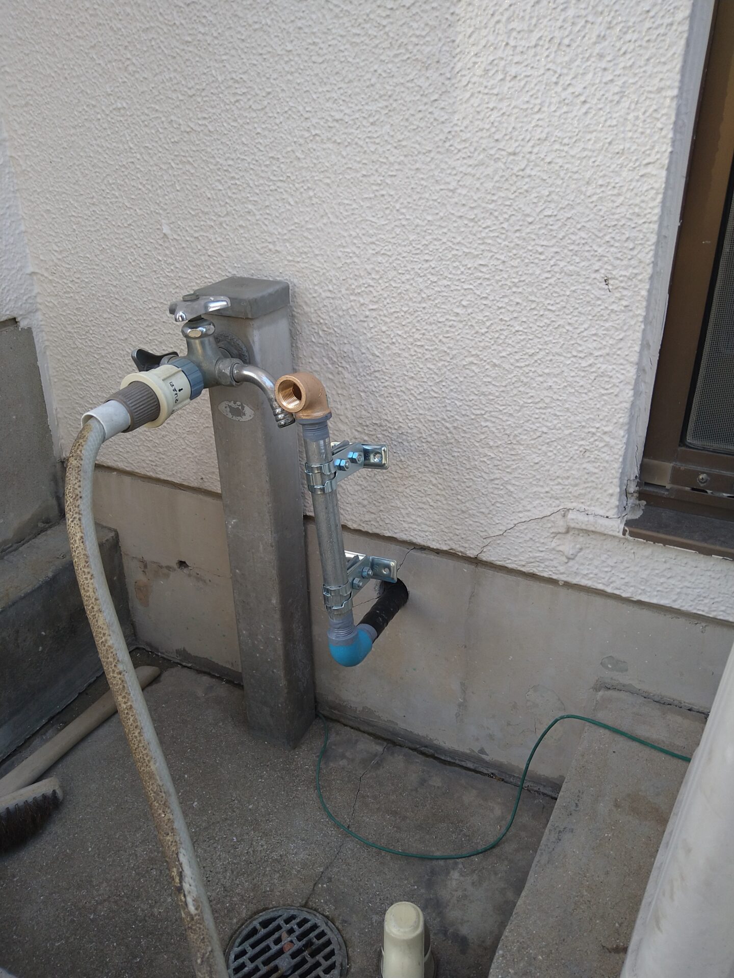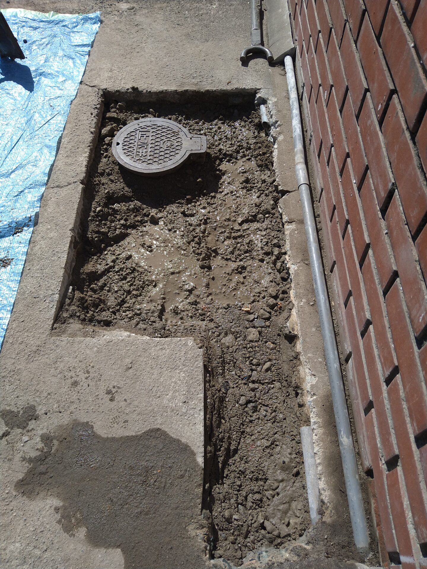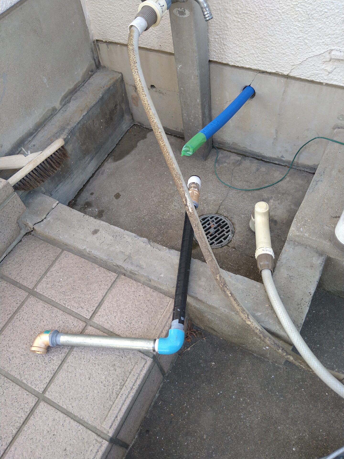 本日は、土間コンクリートやアプローチタイル補修や給水配管布設を、おこないます。