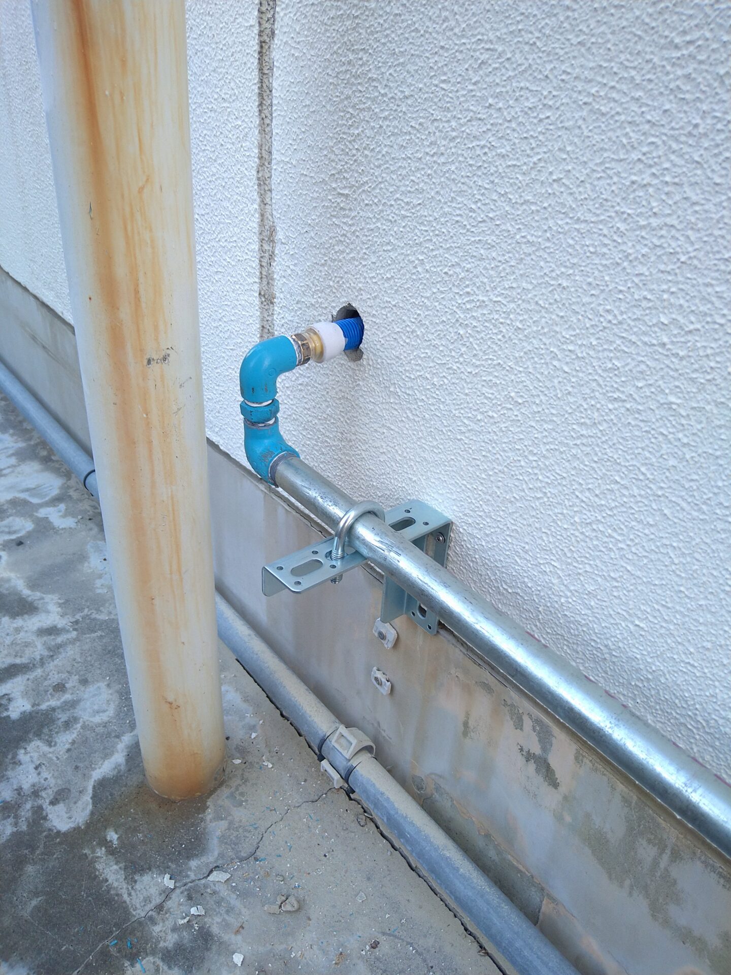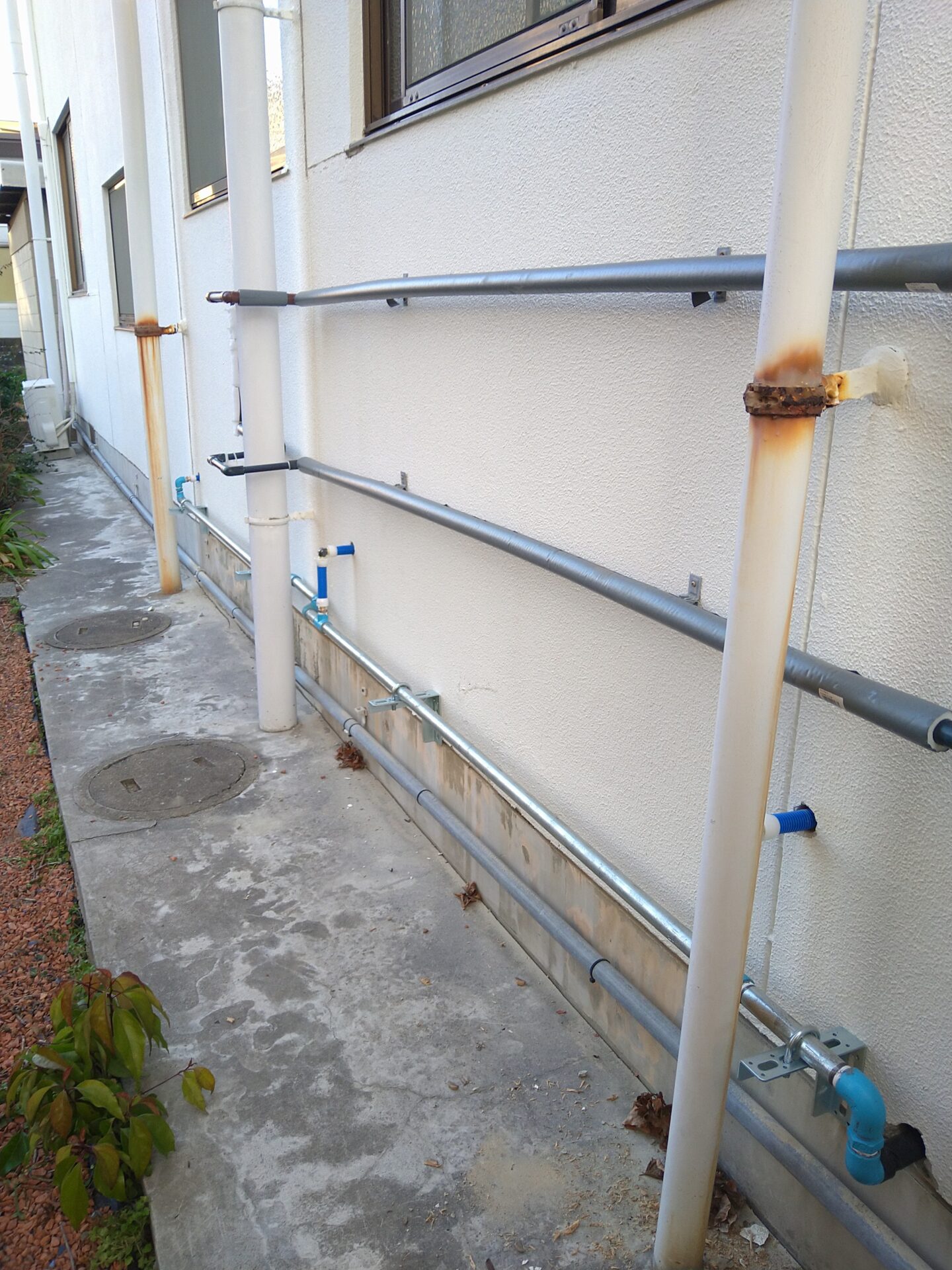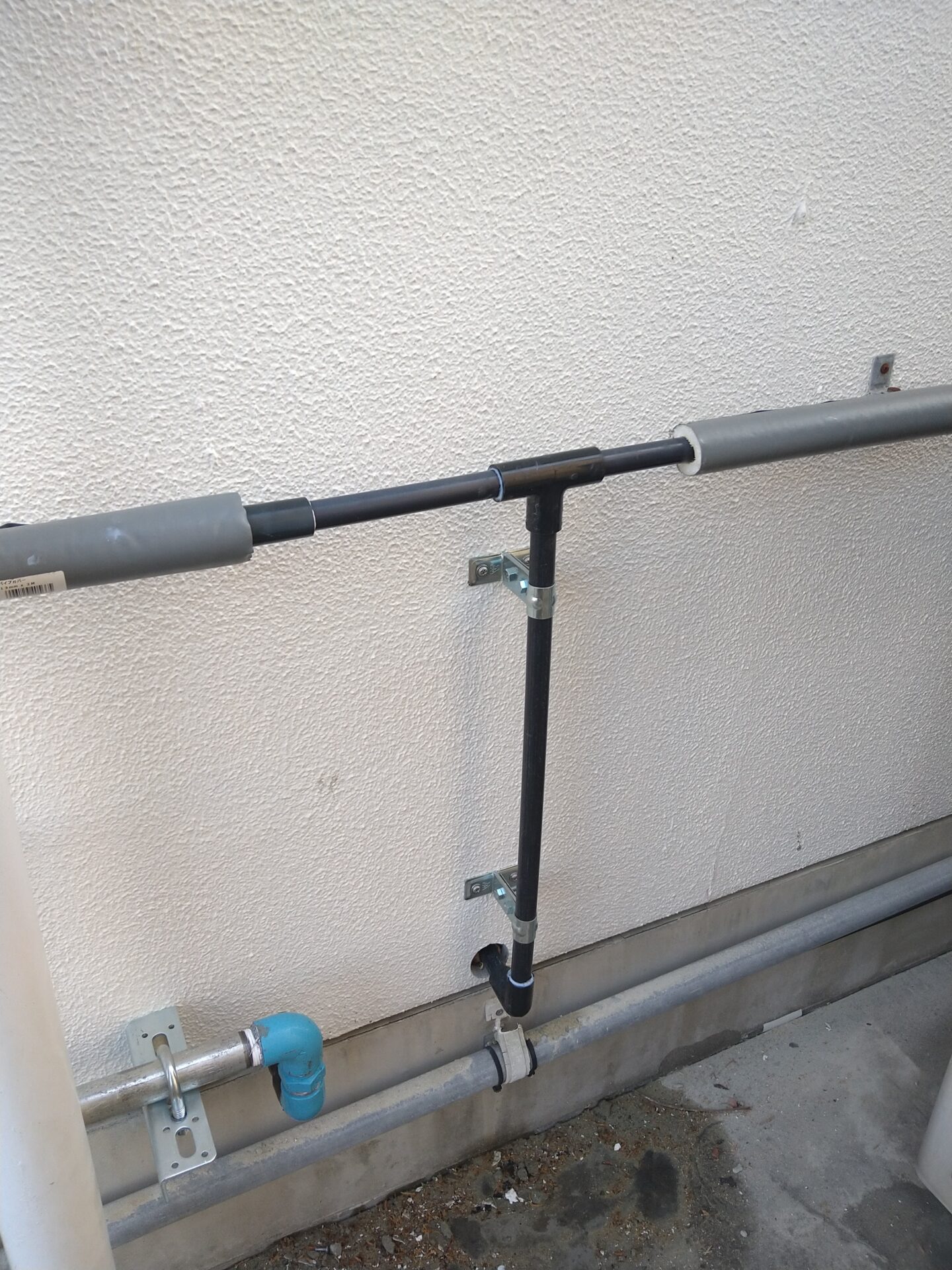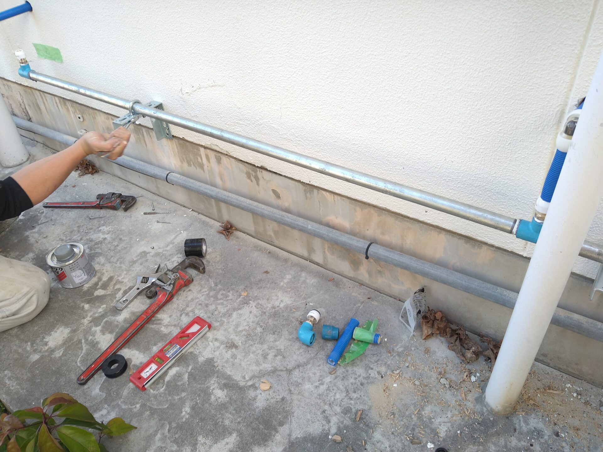 2階水槽への接続を残して給水配管布設を完了しました。漏水がないように注意して、しっかりと固定しました。
