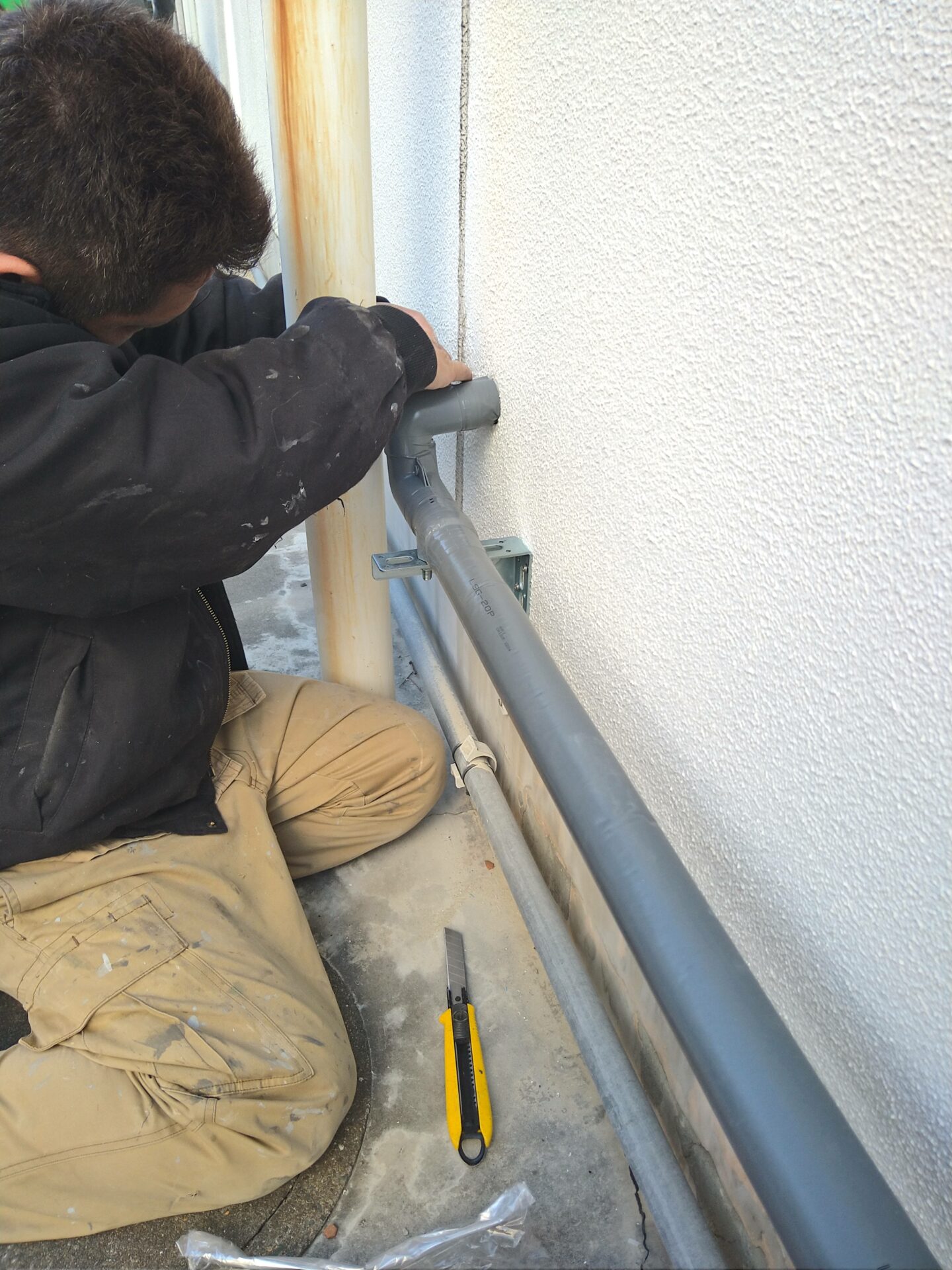 本日は、2階水槽への配管や保温材施工等を、おこないます。