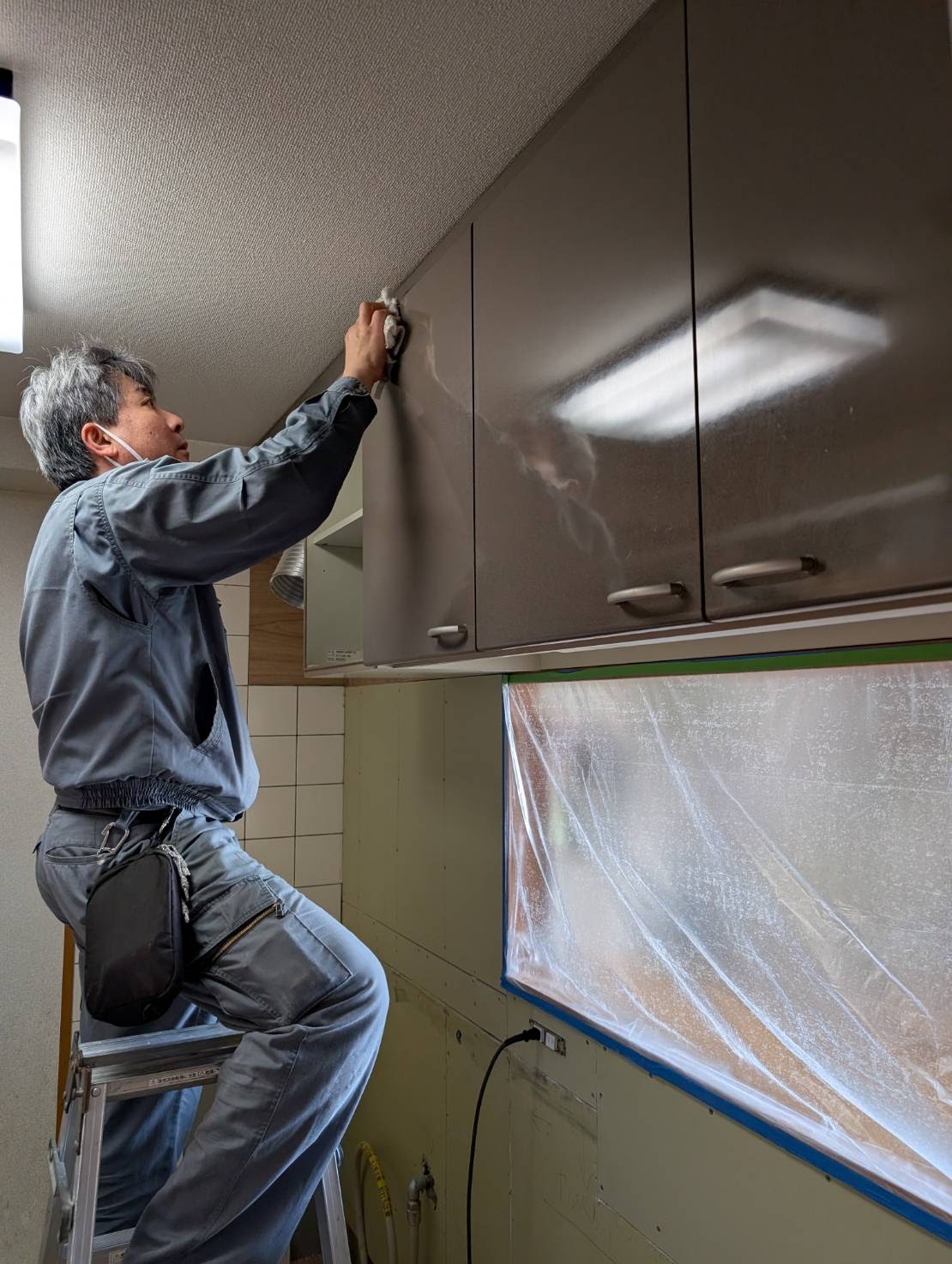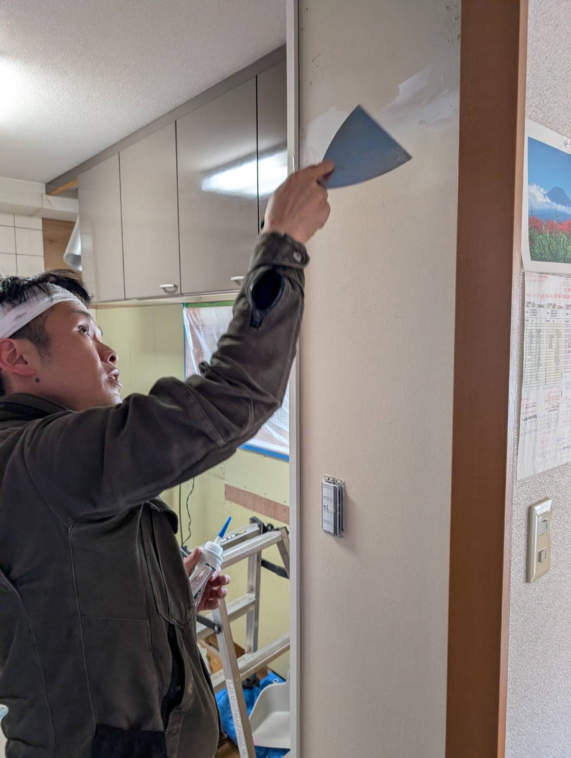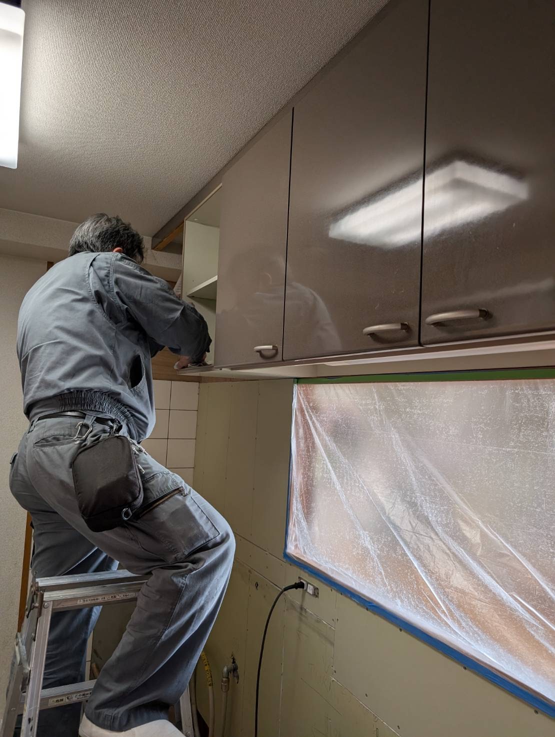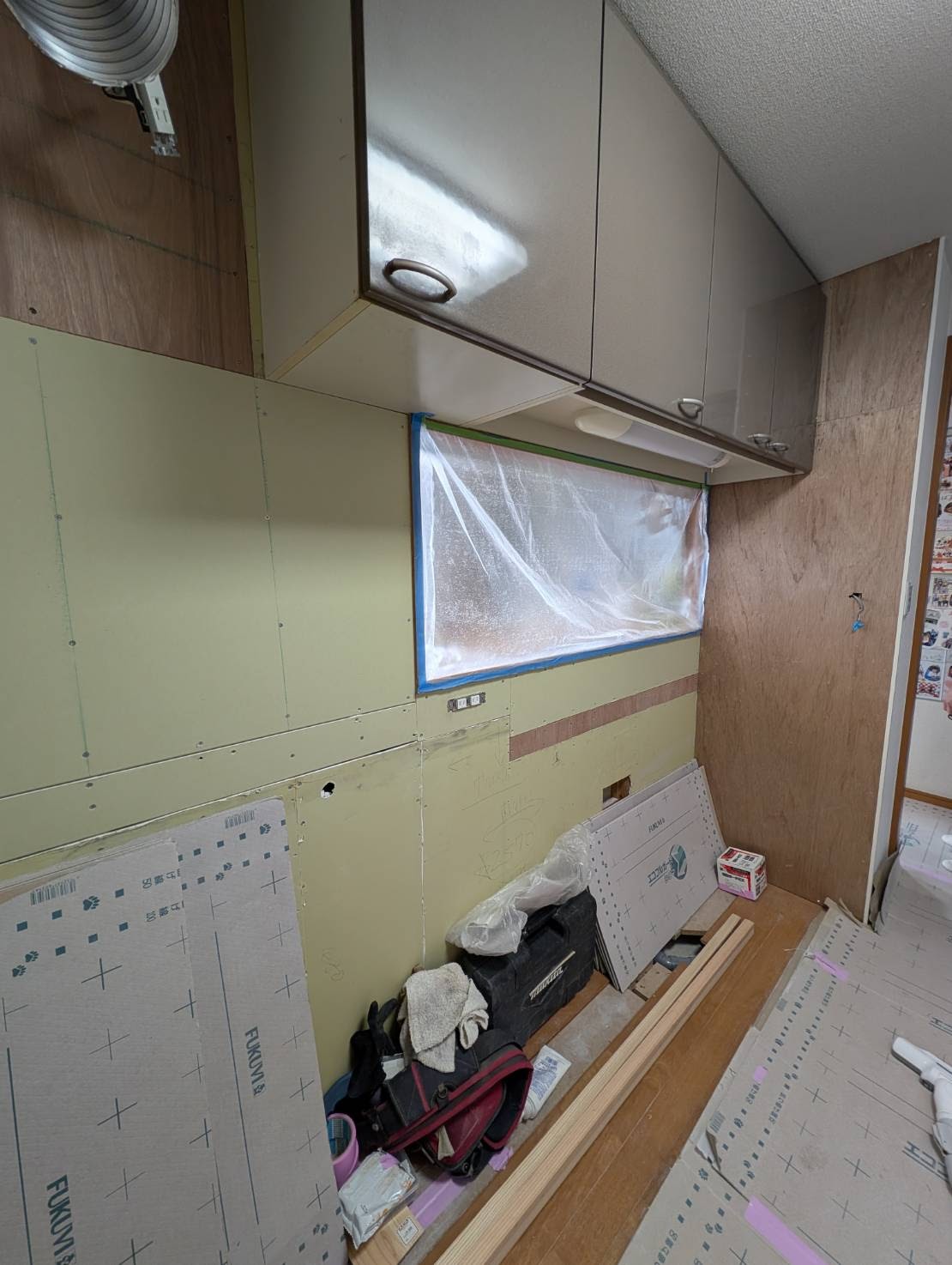 本日は、システムキッチンの磁石がくっつくキッチンパネル下地張りやビニールクロス補修及びコンクリート躯体側のタイル剥ぎ取りが不可能な一面の清掃を、おこないます。