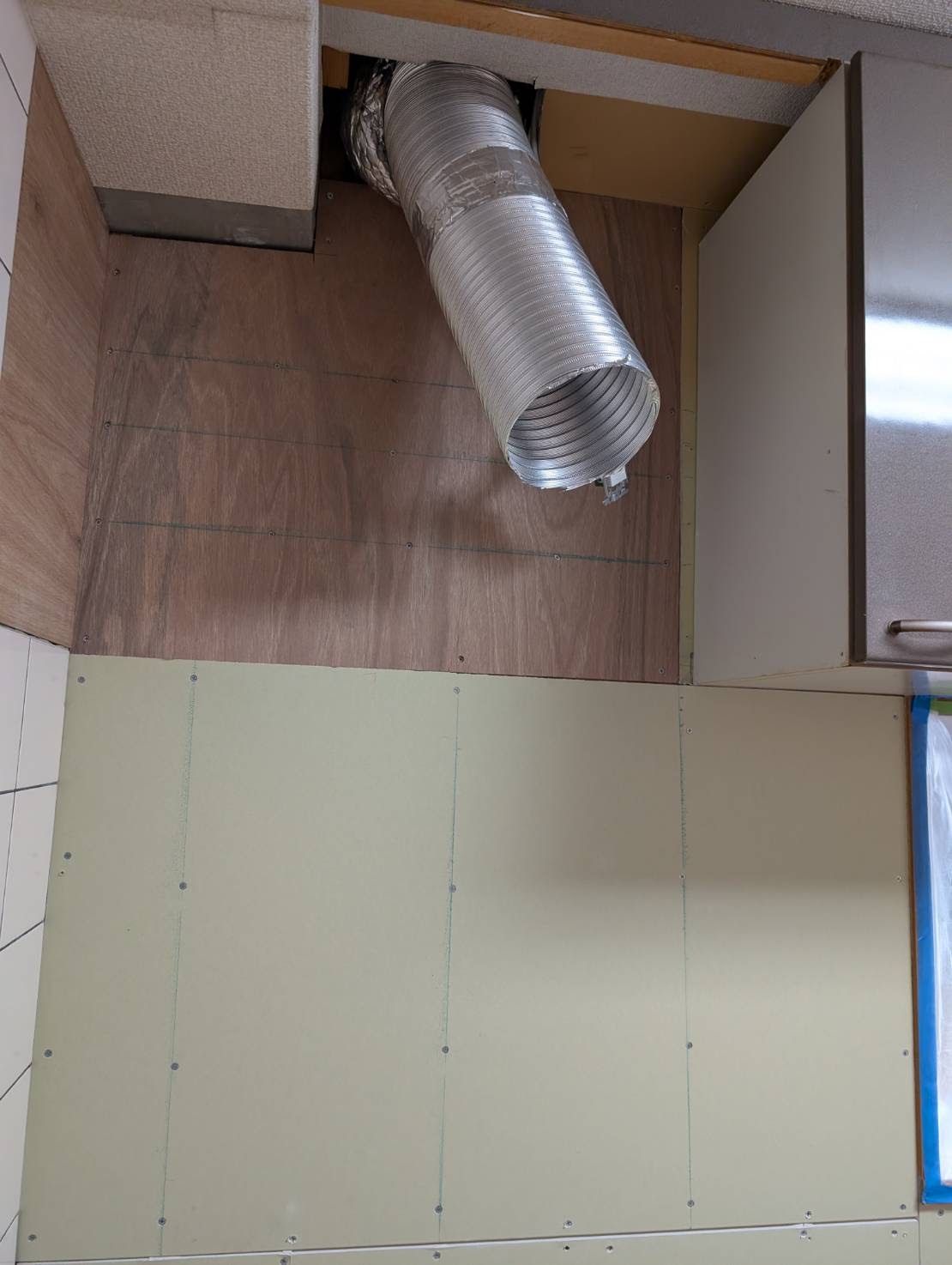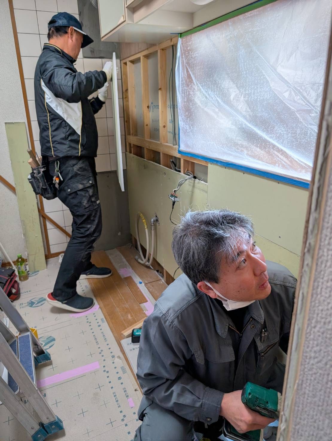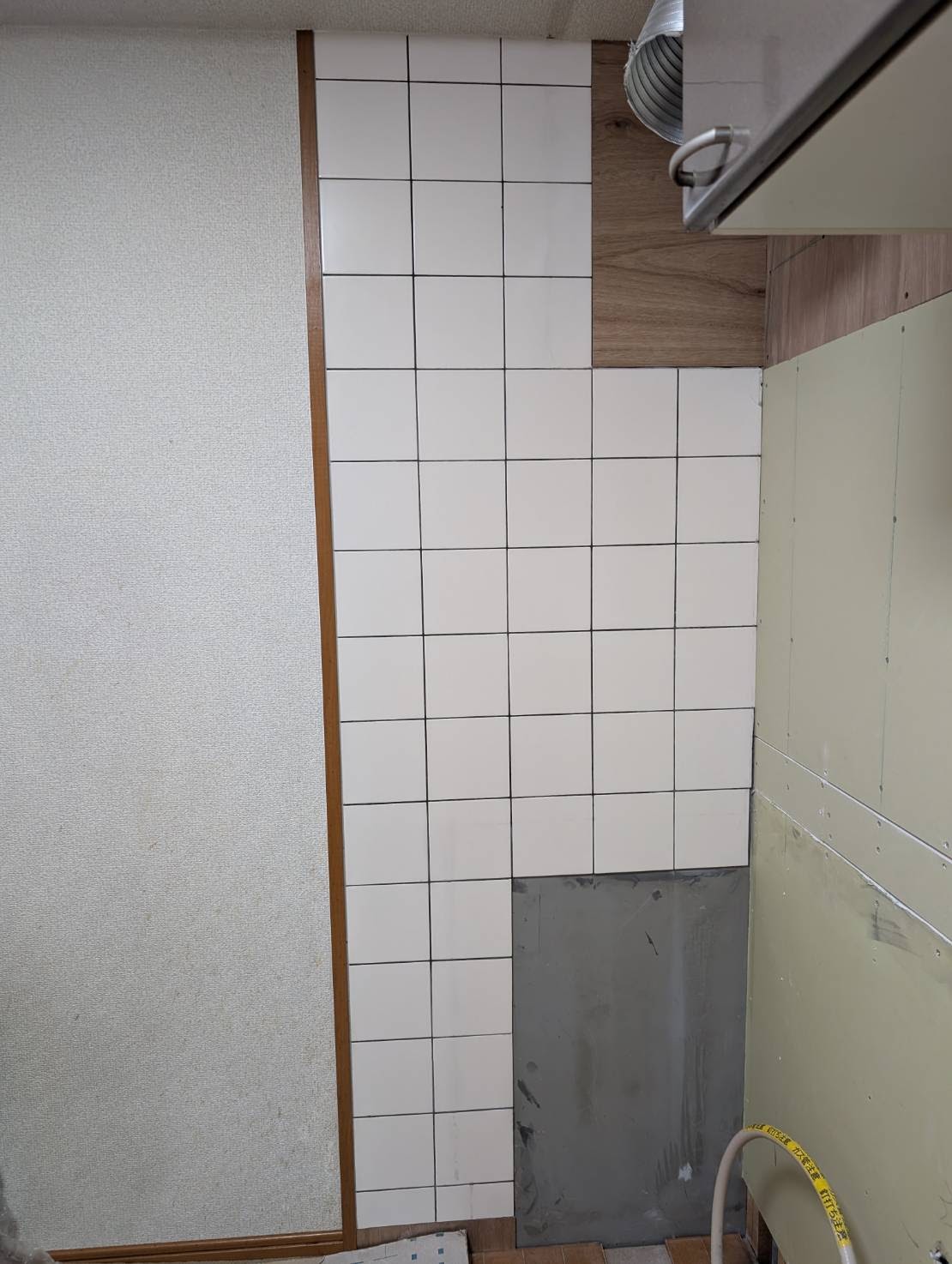 朝一番に給排水配管の漏水確認して大丈夫でした。とても大事な事で安心しました。作業の下地材張りや見切材の取付及びビニールクロス補修も完了しました。タイルもとても綺麗になりました。キッチンパネルもしっかりと張れます。明日は、磁石がくっつくキッチンパネル張りから タカラスタンダード エーデル の設置です。