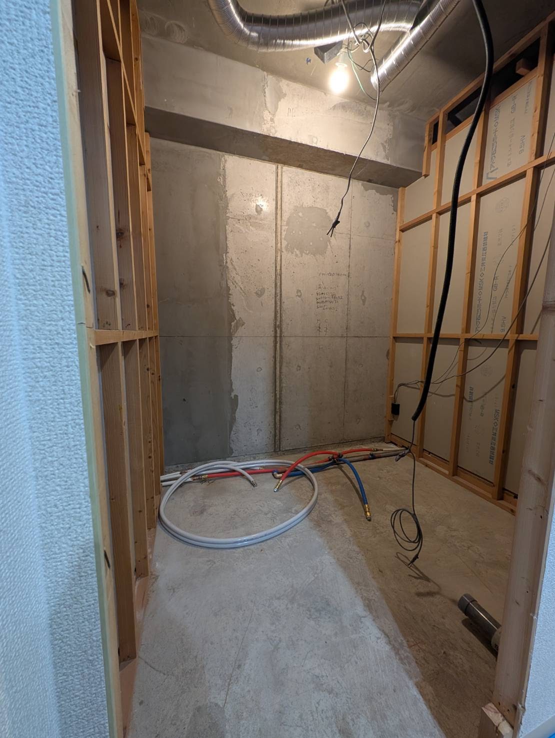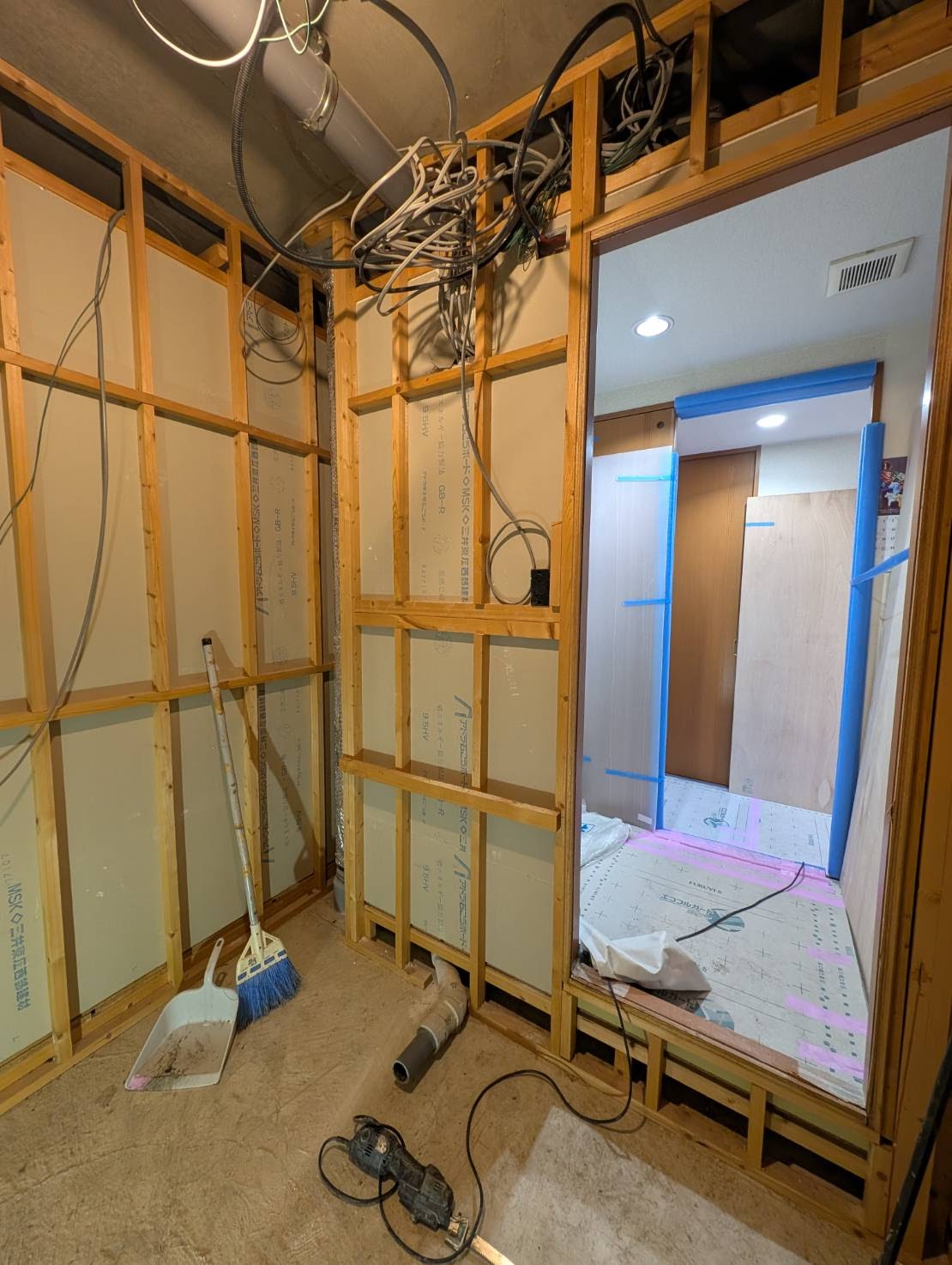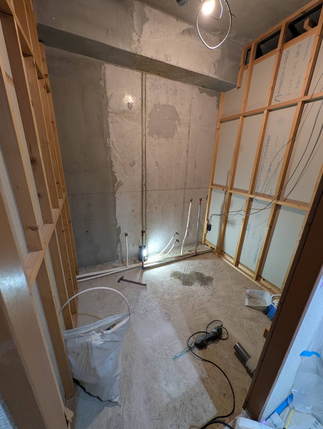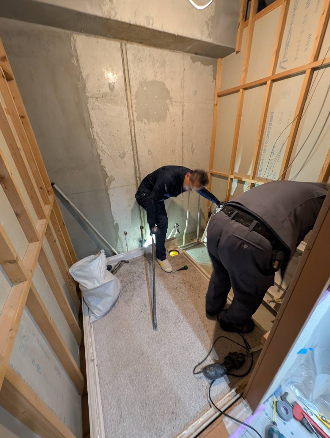 解体撤去後の間仕切壁も綺麗でしっかりしています。既設ユニットバスの段差が120mm程度あり高さが気になっていたようですが、新しいユニットバスは半分以下の段差と低くなります。
