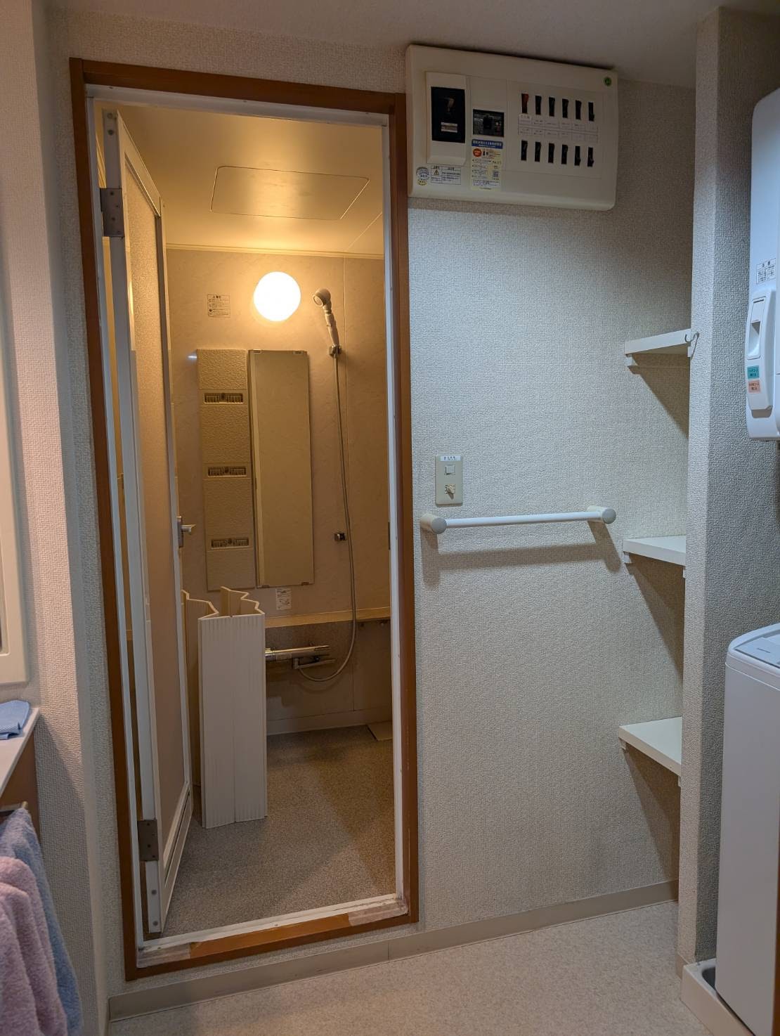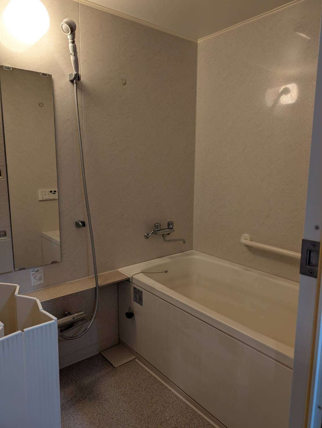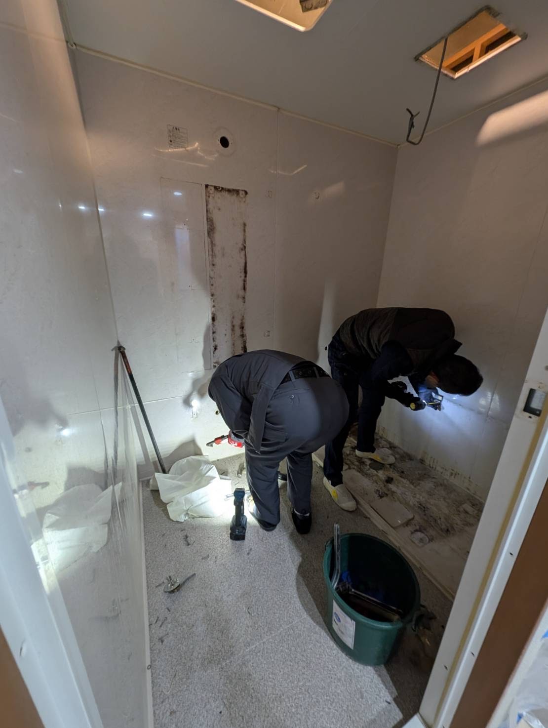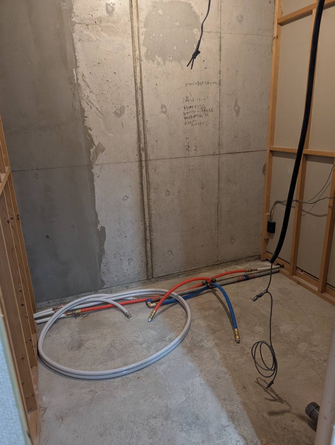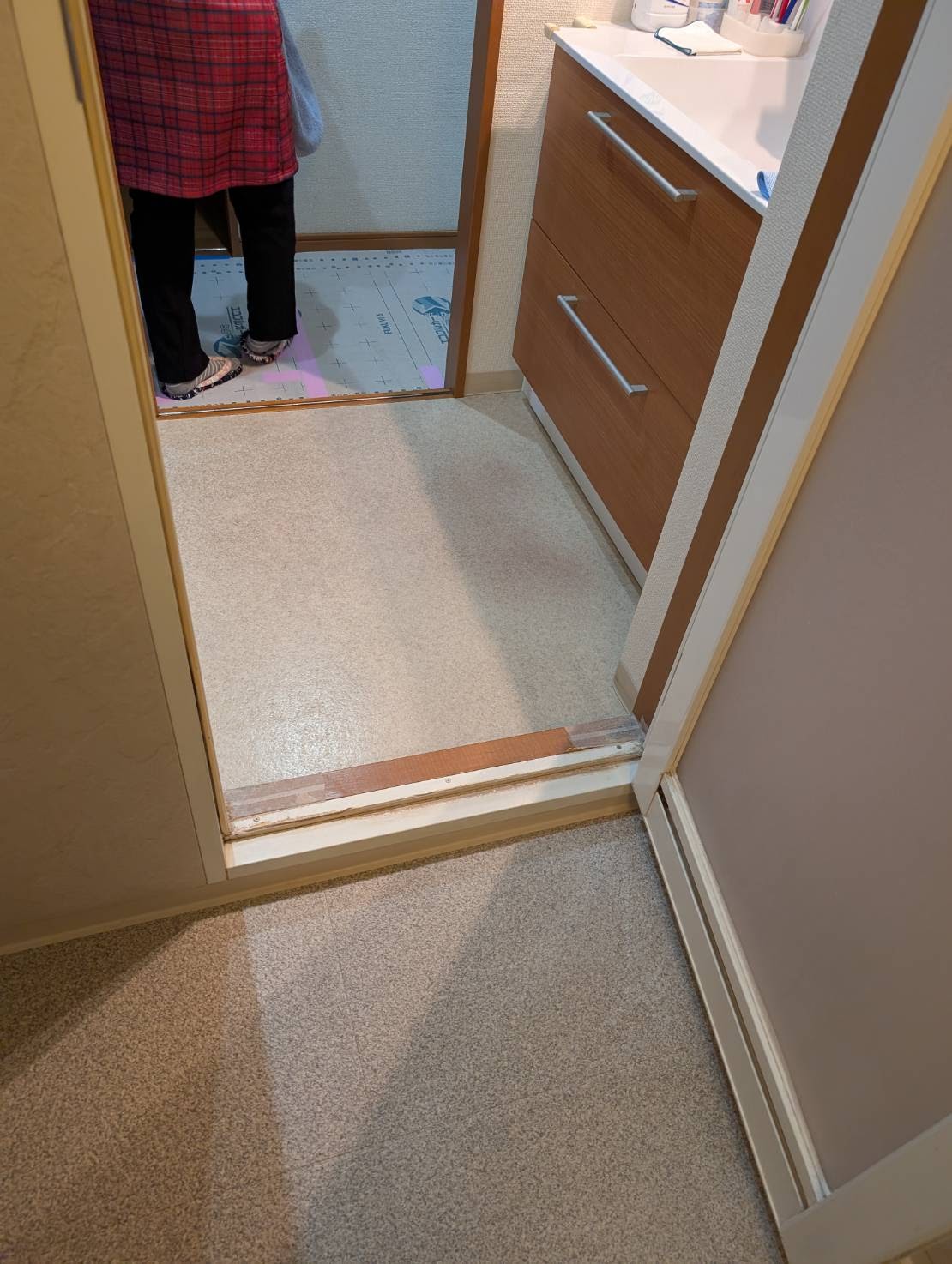 解体撤去後の間仕切壁も綺麗でしっかりしています。既設ユニットバスの段差が120mm程度あり高さが気になっていたようですが、新しいユニットバスは半分以下の段差と低くなります。