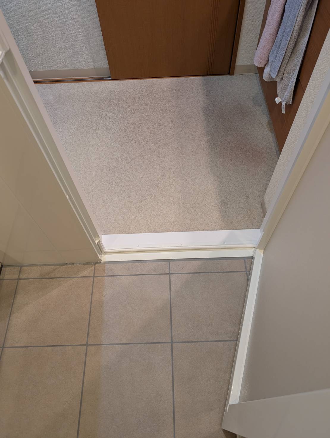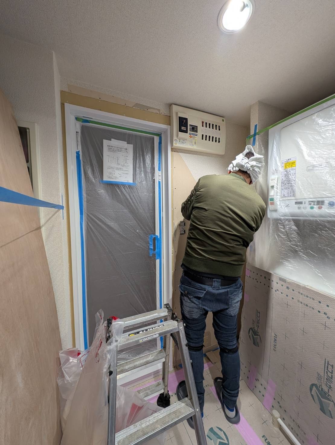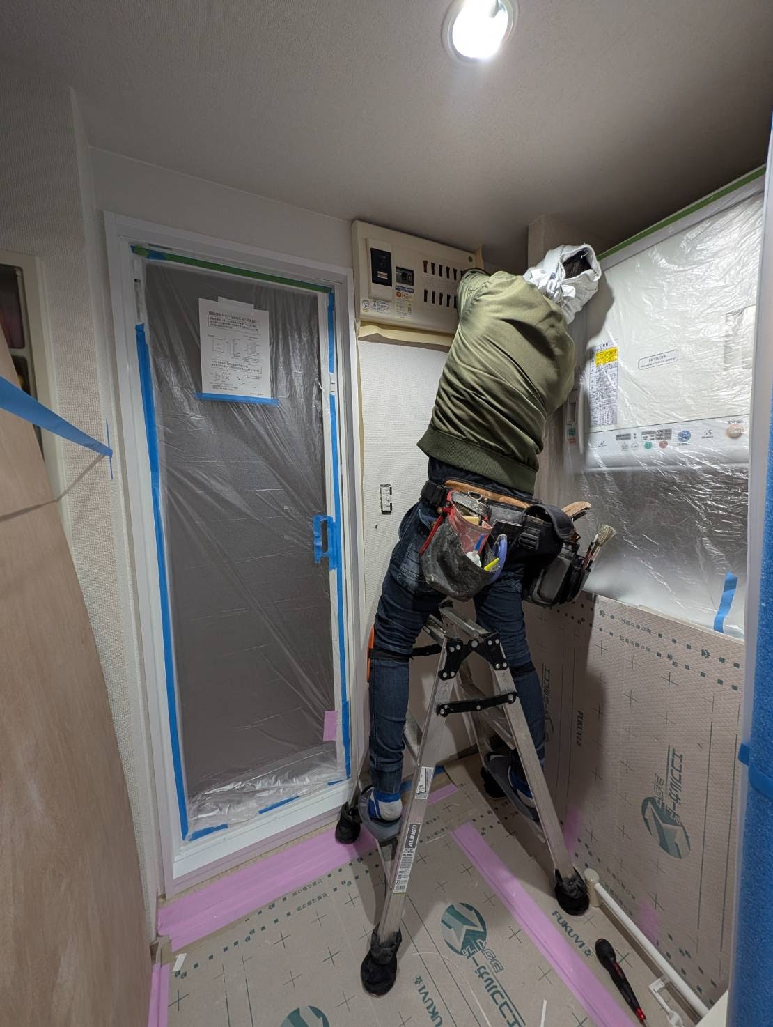 本日は、ユニットバス入口廻りのビニールクロス貼りを、おこないます。