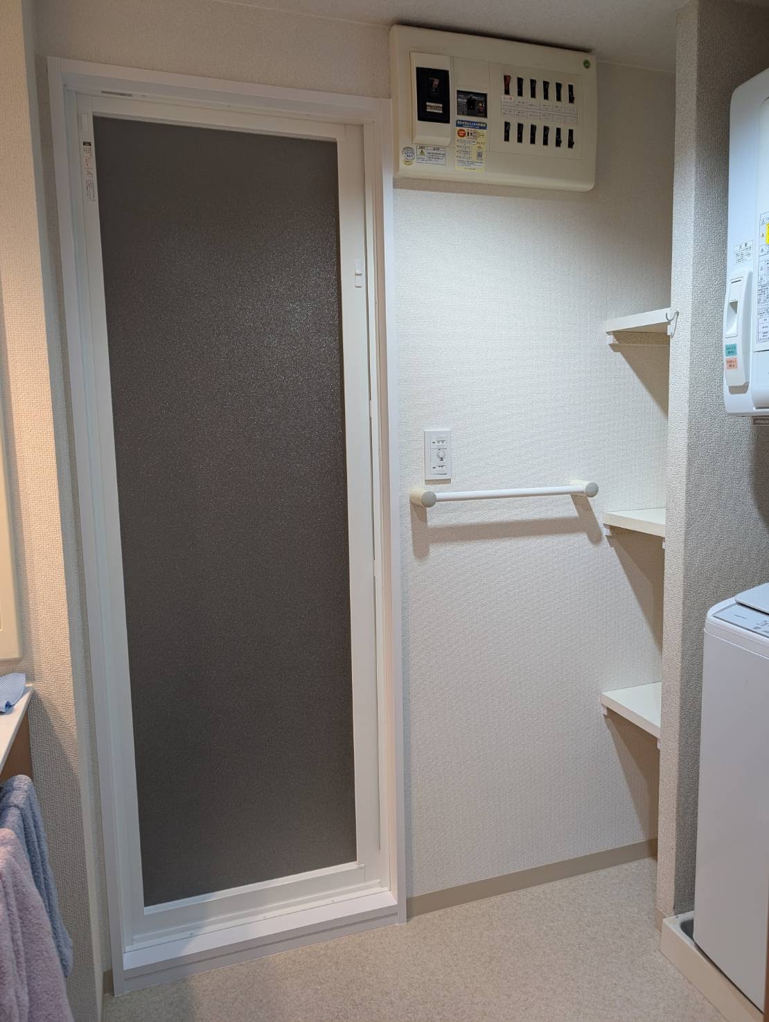 ユニットバス側の一面のみ貼り替えしました。床CFシートや他のビニールクロスは綺麗でしたので、既設のままです。洗面化粧台や給湯器も弊社にて6年前に取替しているので、既設のままです。ユニットバスの入口の段差も低くなり、手摺も2箇所設置し、浴槽の跨ぎ高さも低くなり、大変喜んでいただきました。
