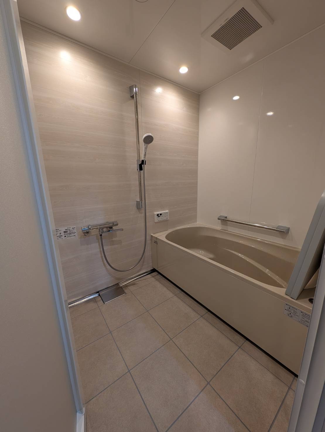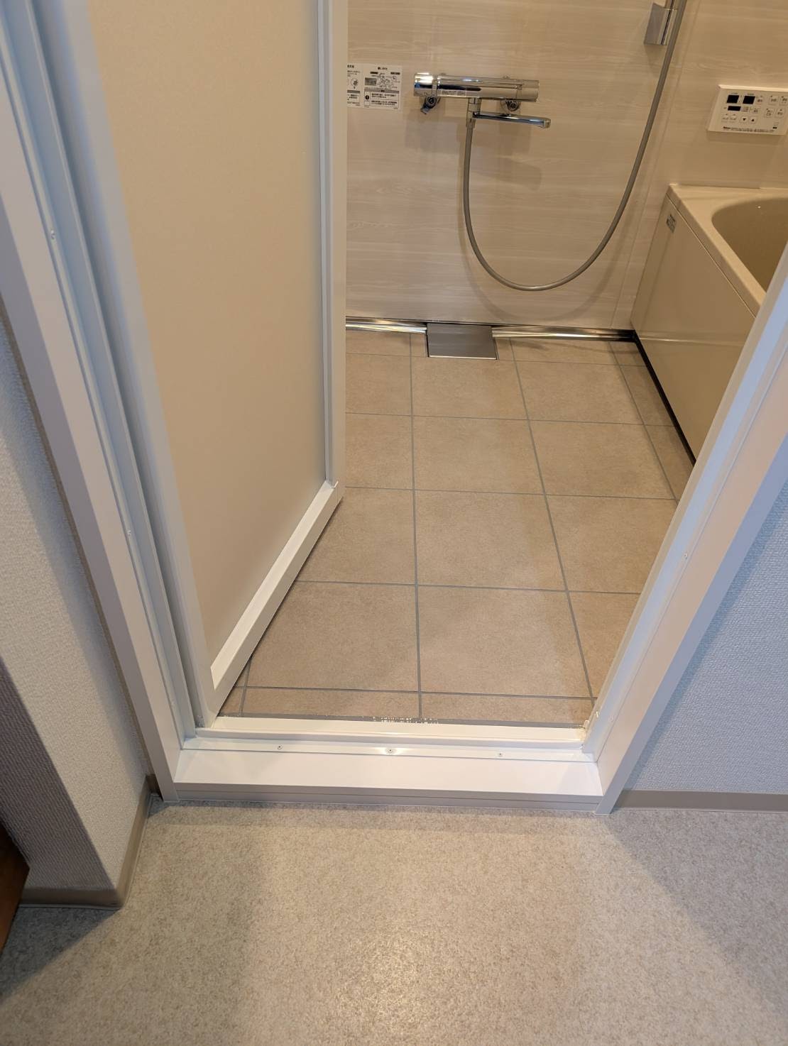 福岡市早良区 マンション内部のユニットバス入口廻りのビニールクロス貼り 段差解消 手摺設置 浴槽跨ぎ高さを低く
