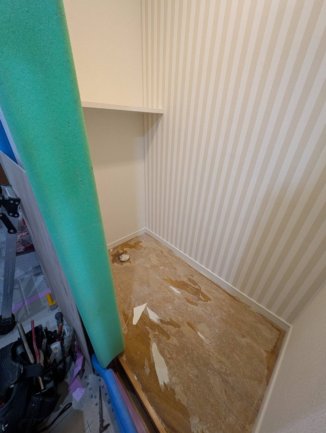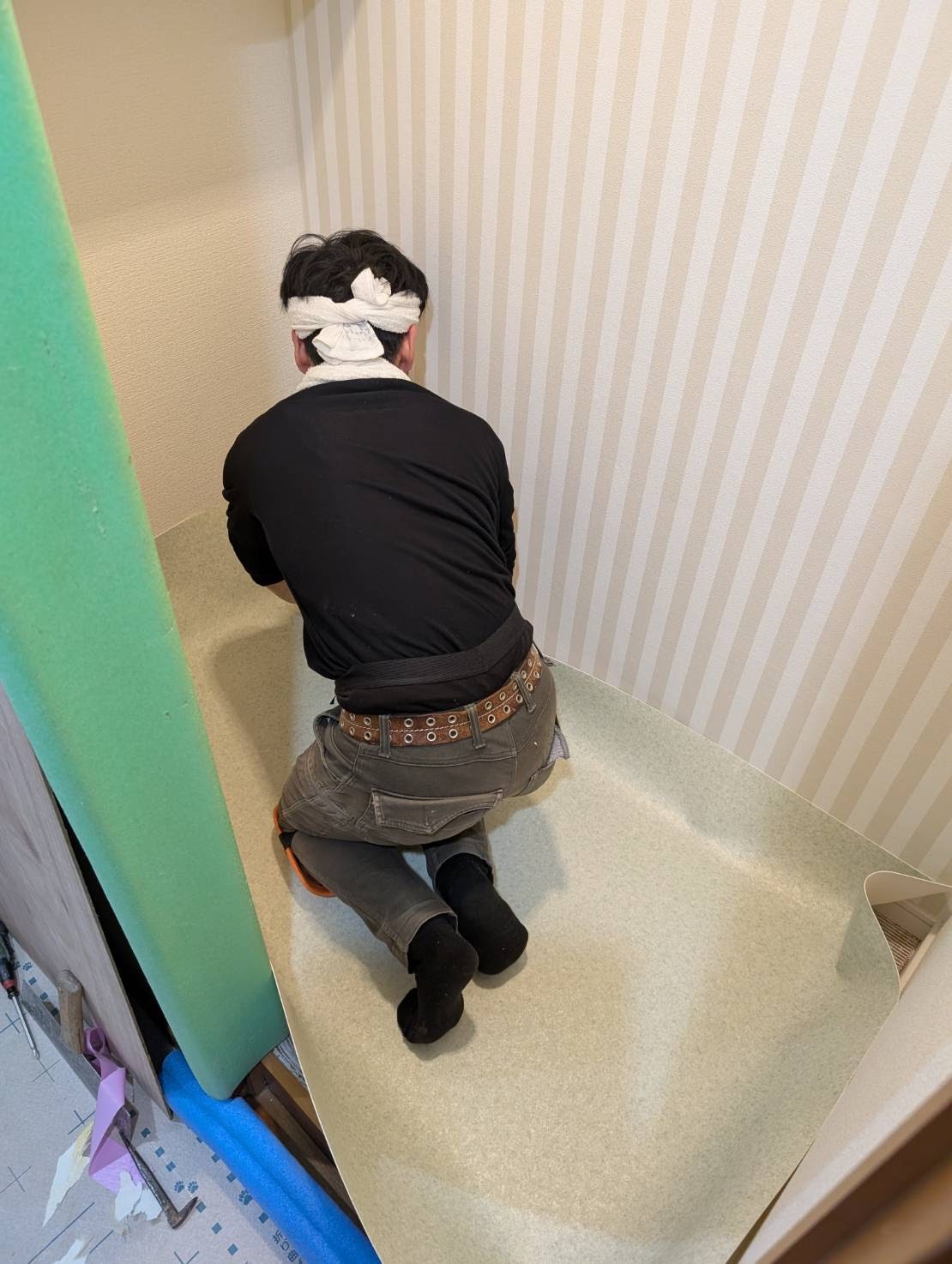 基本、トイレ取替は朝撤去して午後または夕方には新しいシステムトイレの設置を完了します。夕方以降はシステムトイレを使用出来るようにする為です。しかし、塗装及び木製巾木取替や手摺下地組は前日迄の施工を、お勧めします。