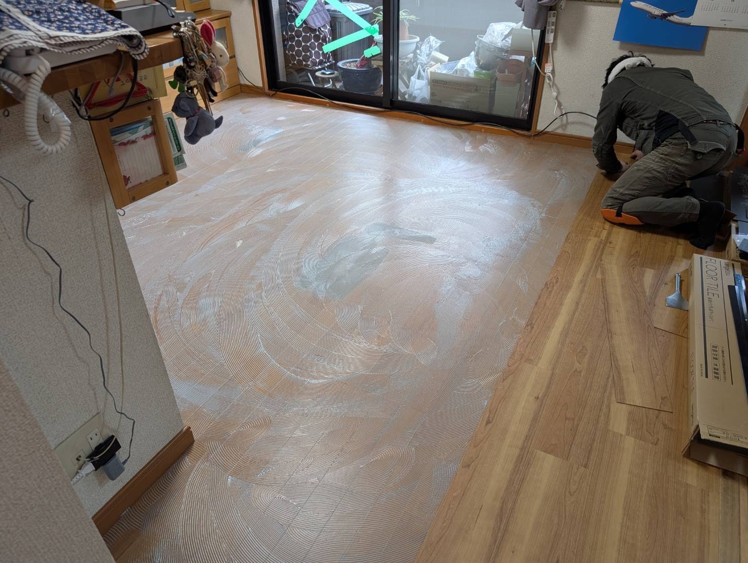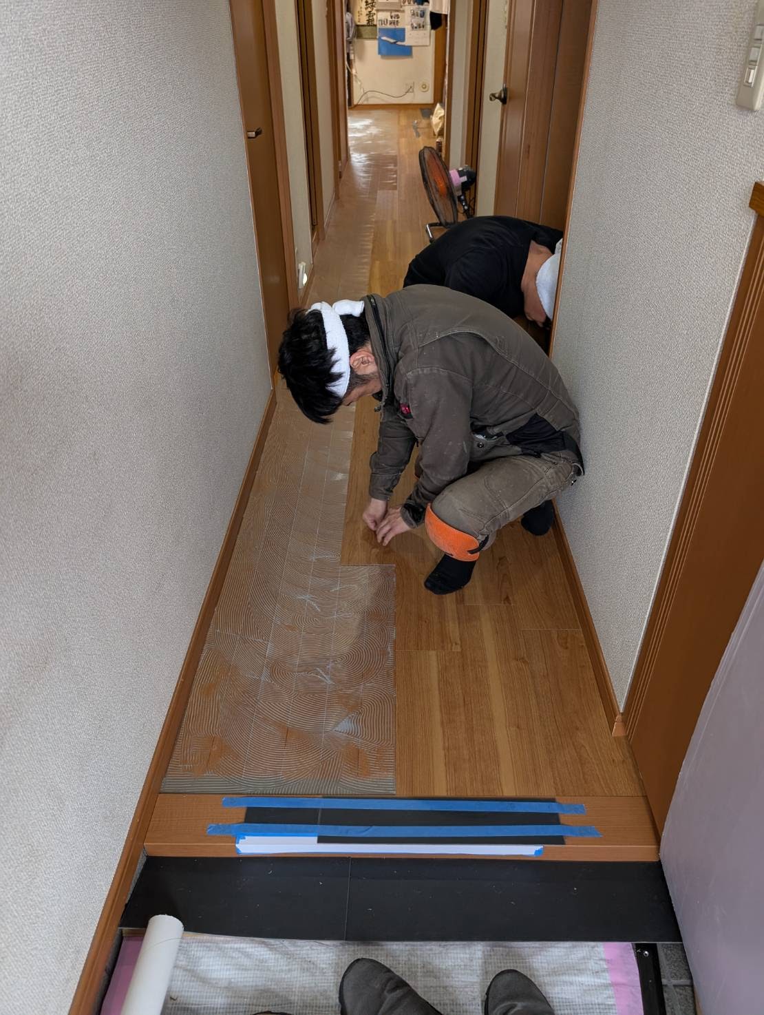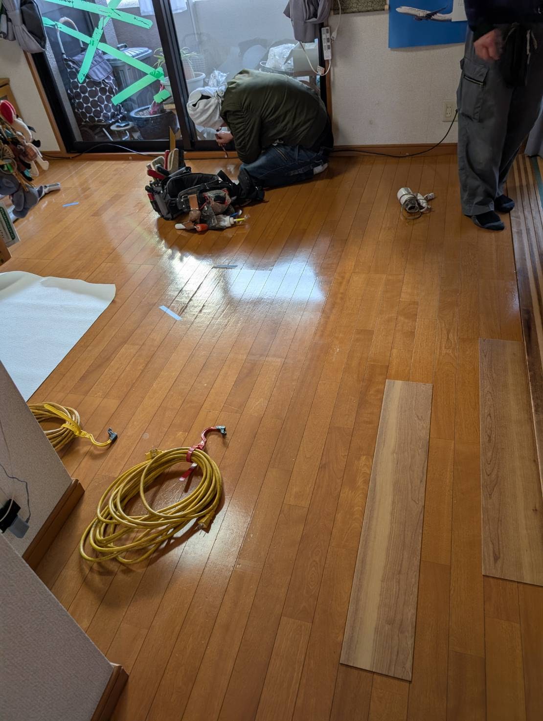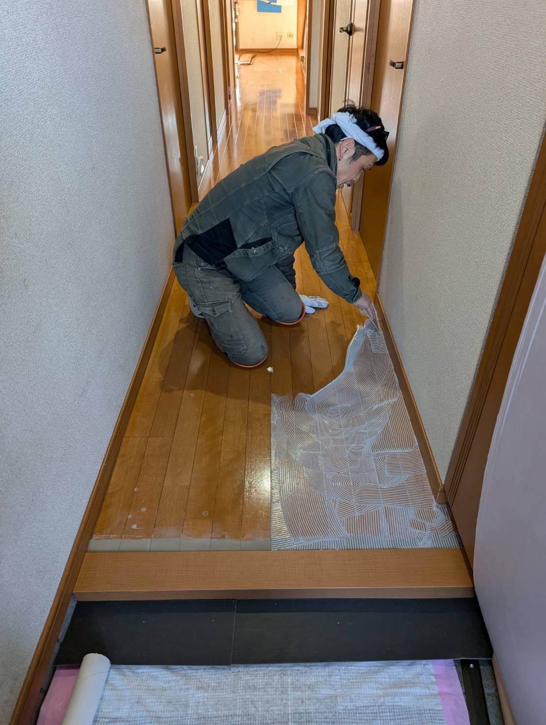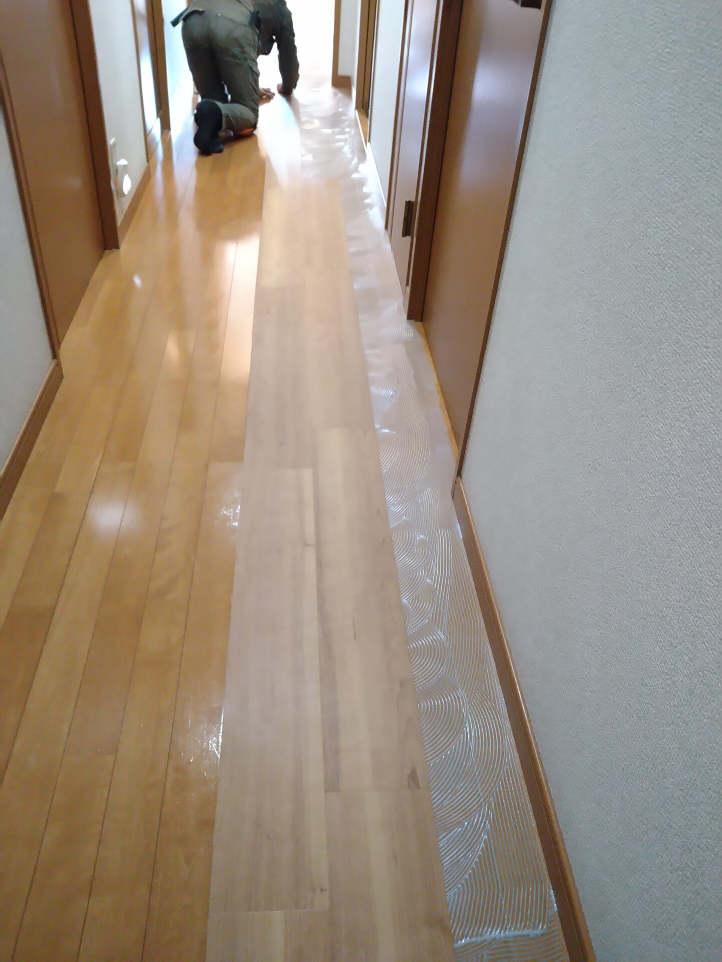 本日は、廊下からリビングのフローリングへサンゲツのフロアタイル張り増しを、おこないます。