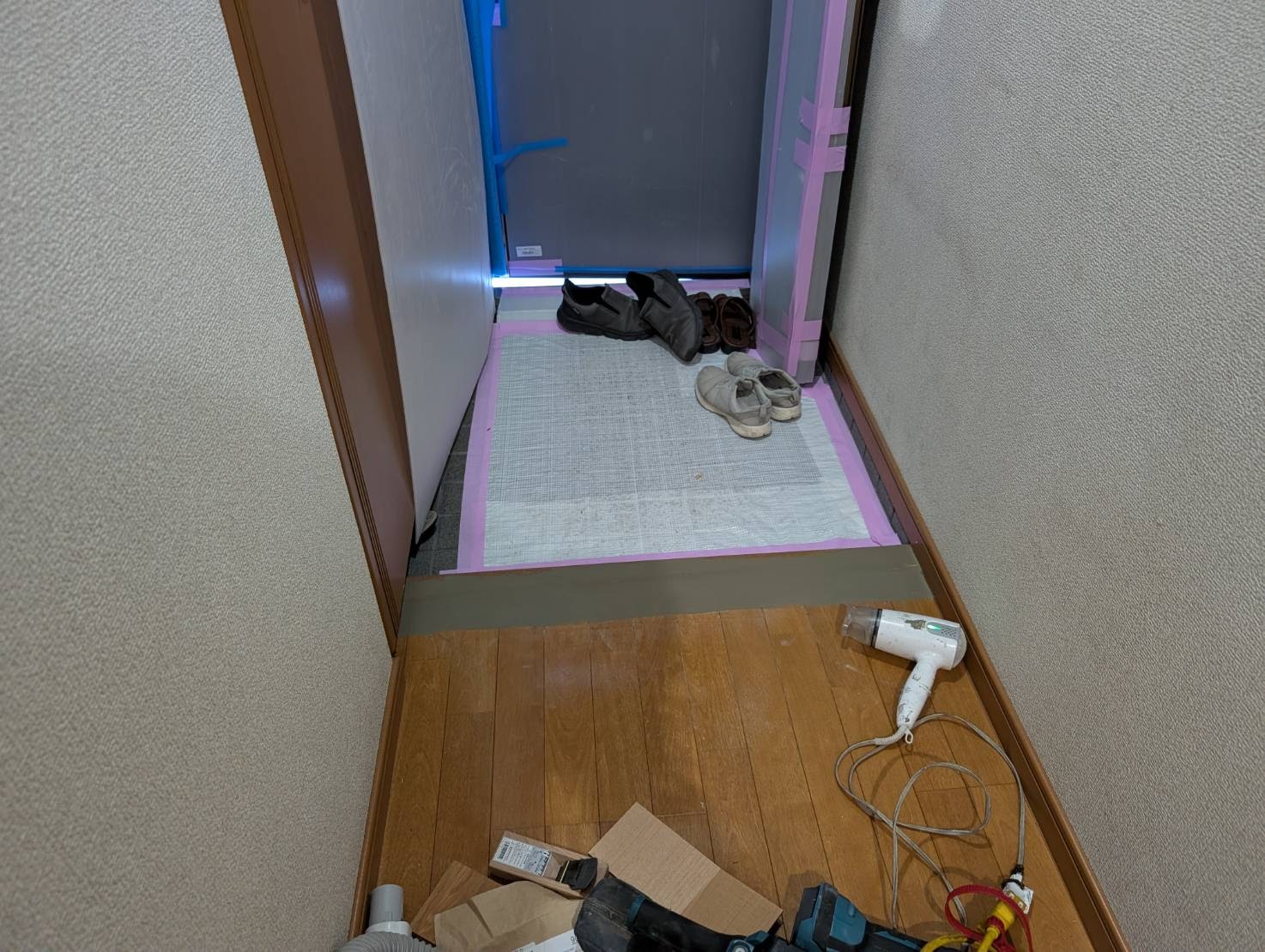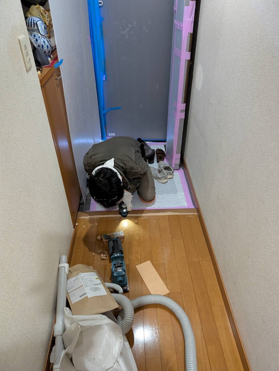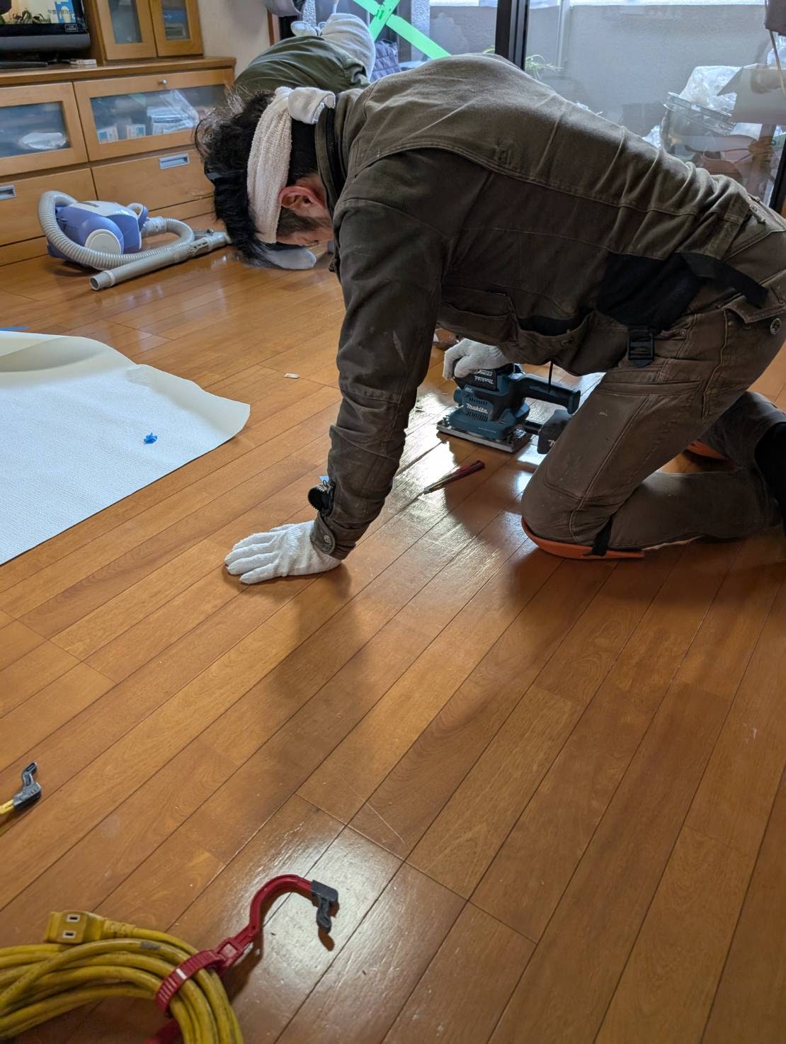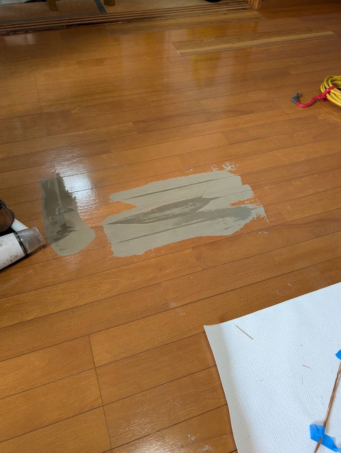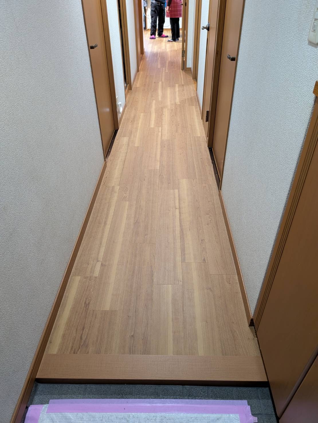 本日は、廊下からリビングのフローリングへサンゲツのフロアタイル張り増しを、おこないます。