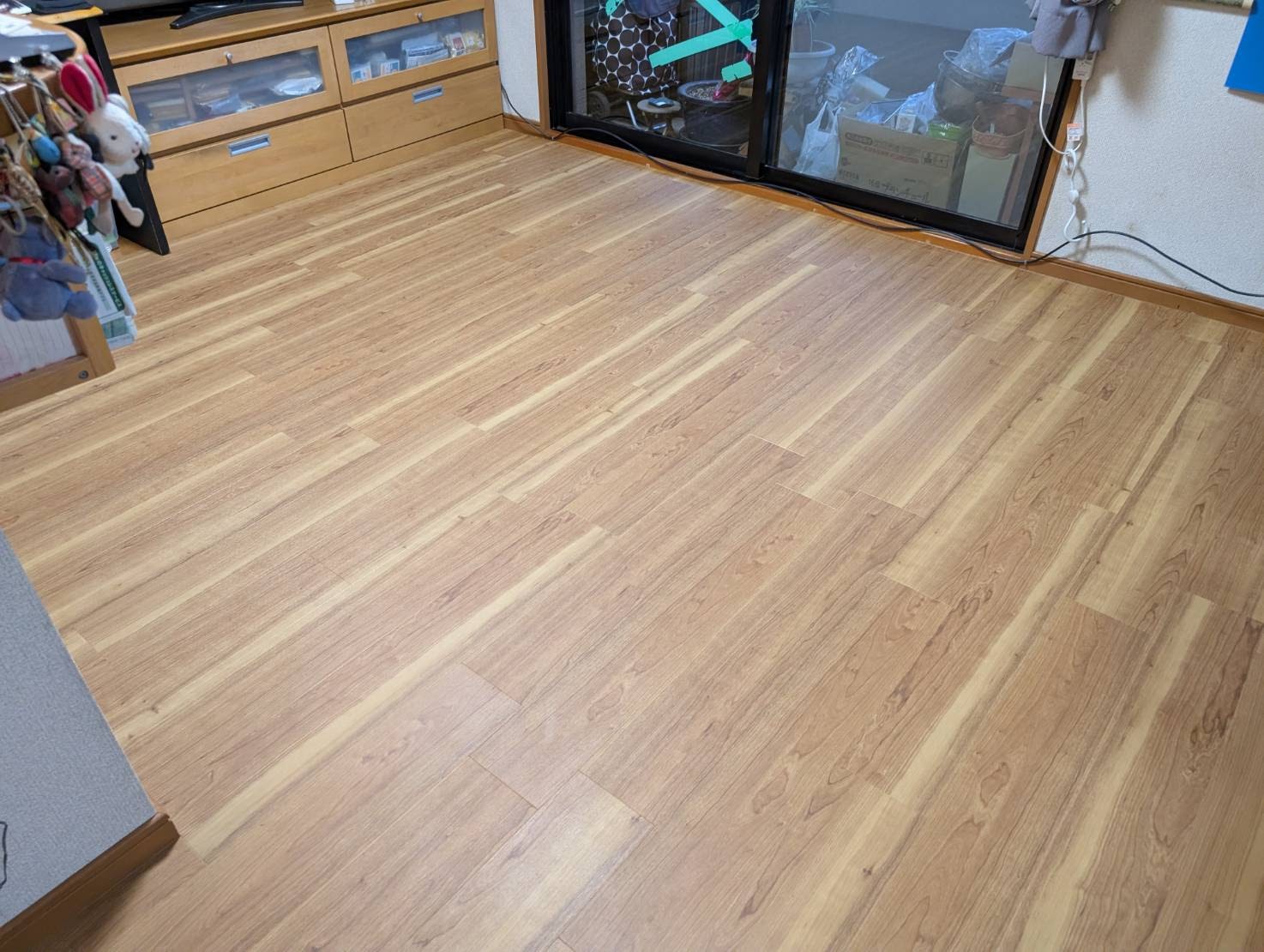 スムーズに施工出来たので1日でほぼ完了しました。しっかりと接着できました。サンゲツ フロアタイル ブラックチェリー色 を張り増ししました。ブラックチェリーはとても人気のある色柄で、建具や枠にも合いました。
