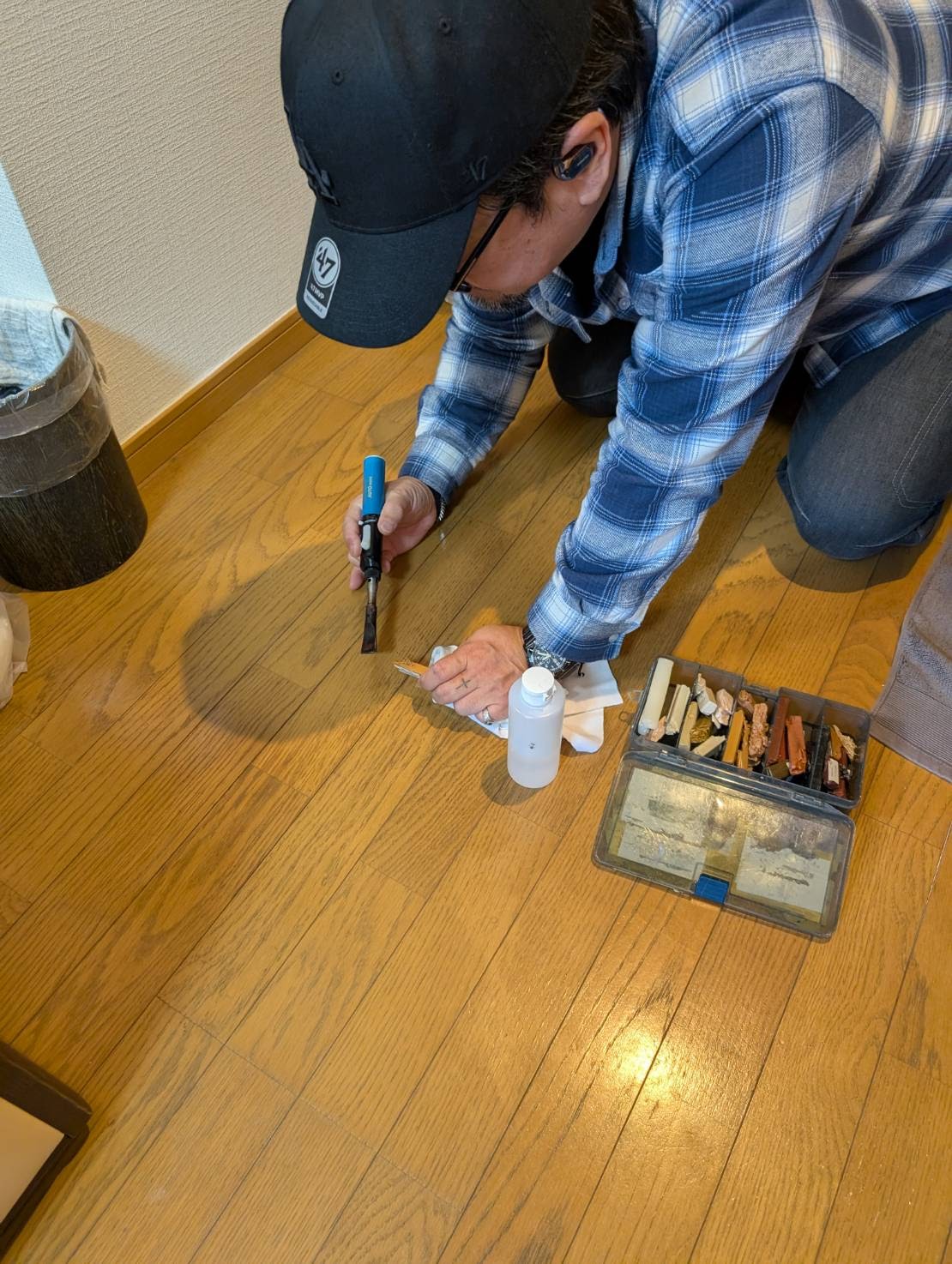 本日は、フローリング床の補修 リペア作業を、おこないます。