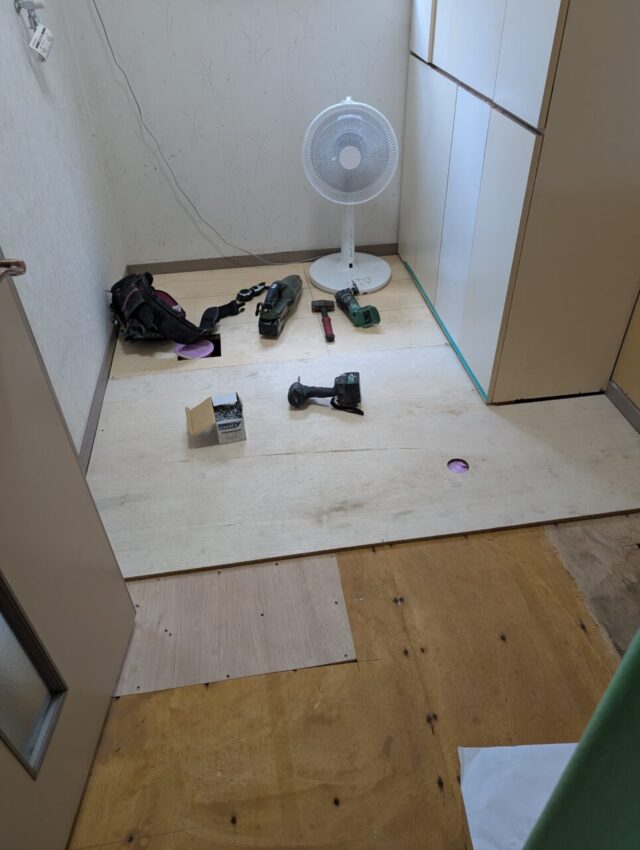 床のブヨブヨした部分を補修したうえで、上から合板を張りましたので、床がしっかりしました。